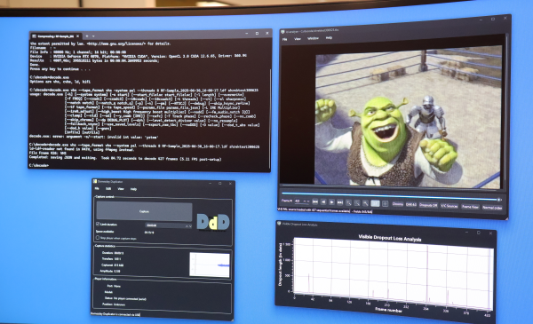 Her ser du at den gamle Pioneer-maskinen til Ragnhild har fått ein ekstra leidning lodda fast på kretskortet på eit testpunkt med merkelappen «VIDEO ENV», som elles blir brukt under servicearbeid for å teste og kalibrere maskinen. Frå dette punktet fangar denne leidningen opp det analoge radiofrekvens (RF)-signalet frå videokassetten, og sender det så inn i DomesdayDuplicator, som igjen konverterer RF-signalet til digital data og lagrar det på ein datamaskin over USB med hjelp av dedikert programvare. Fila du får i denne prosessen er det næraste du kjem ei 1:1 digital gjengiving av videoinformasjonen som er på kassetten din, men ikkje i ein form du berre kan dobbeltklikke på og spele av. Dette dataet må me først køyre gjennom programmet VHS-decode, og etter ei lita stund har du ei fil som kan opnast i eit anna program som heiter ld-analyse. Her kan du faktisk sjå videodataen bilete for bilete, analysere videoen og t.d. gjere fargejusteringer. Vidare brukar me eit anna program som heier tbc-video-export, som til slutt gjer oss ei lossless videofil i FFV1/MKV-format. Og vipps, så er videoen vår gjort om til ei digital fil, som vidare kan gå gjennom post-prosessering, noko som er eit helt eige kapittel i seg sjølv.